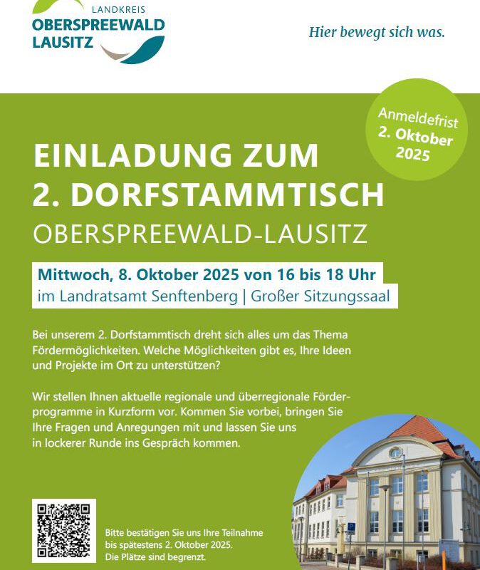 Das Organisationsteam, bestehend aus der Mitarbeiterin für bürgerschaftliches Engagement und Ehrenamt des Landkreises Oberspreewald-Lausitz, der Dorfbewegung Brandenburg e.V./Netzwerk Lebendige Dörfer sowie der Lokalen Aktionsgruppe Energieregion im Lausitzer Seenland lud am 8. Oktober 2025 um 16 Uhr in das Landratsamt nach Senftenberg zum bereits 2. „Dorfstammtisch OSL“ ein.