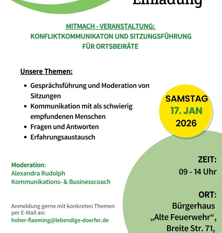 Das Netzwerk Lebendige Dörfer „Hoher Fläming“ lädt am 17. Januar 2026 alle Akteure aus den Dörfern der Region zum Mitmach-Workshop zum Thema „Gesprächsführung, Sitzungsleitung und Konfliktkommunikation für Ortsbeiräte“ nach Treuenbrietzen ein. Ziel der Veranstaltung ist es ein Angebot zu unterbreiten, welches eine souveräne und effiziente Leitung von Ortbeiratssitzungen und einen besseren Umgang mit Störungen zu finden, ermöglicht.