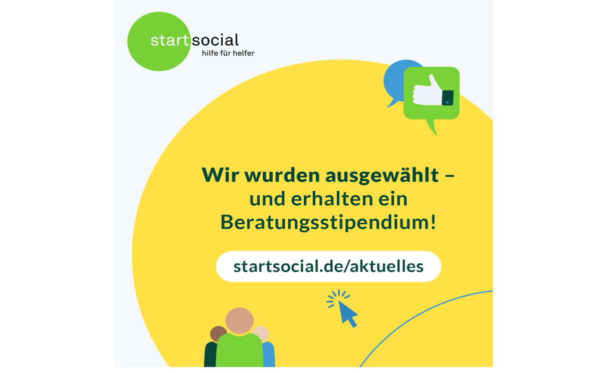 Im November starten wir gemeinsam mit 99 weiteren Initiativen in ein viermonatiges Stipendium. Im Mittelpunkt eines startsocial-Stipendiums steht die Steigerung der Wirkung unserer Initiativen durch Beratung, Wissenstransfer und Vernetzung zwischen Wirtschaft und Zivilgesellschaft. Jeweils im Tandem begleiten uns erfahrene Fach- und Führungskräfte vier Monate lang, um gemeinsam Strategien und Maßnahmen für eine erfolgreiche Weiterentwicklung und Professionalisierung zu erarbeiten.
